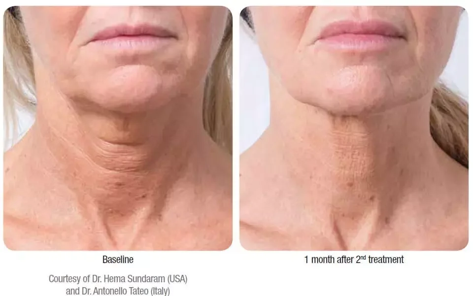 Full results typically develop after the second treatment, as new collagen and elastin form — giving the skin a firmer, lifted appearance. -